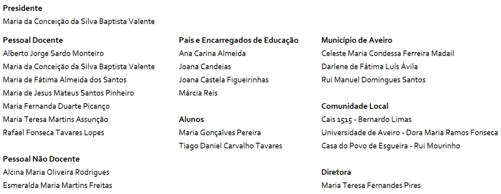 O Conselho Geral do Agrupamento de Escolas de Esgueira para o quadriénio 2026‑2030, iniciou funções em 4 de fevereiro de 2026, mantendo‑se a representatividade dos discentes e dos pais/encarregados de educação correspondente ao biénio 2025‑2027.